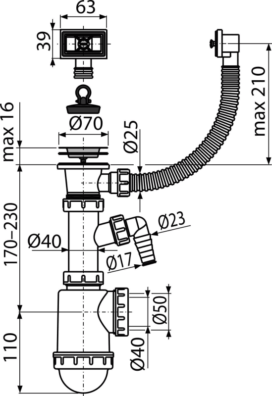 Sifon za sudoperu sa nerđajućom mrežicom DN70, fleksi prelivom i priključkom